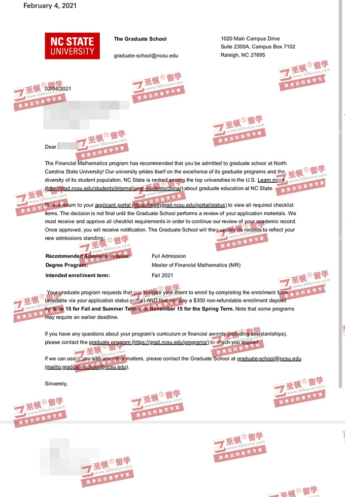 录取结果:North Carolina State University,Master of Financial Mathematics北卡罗来纳州立大学金融数学硕士录取