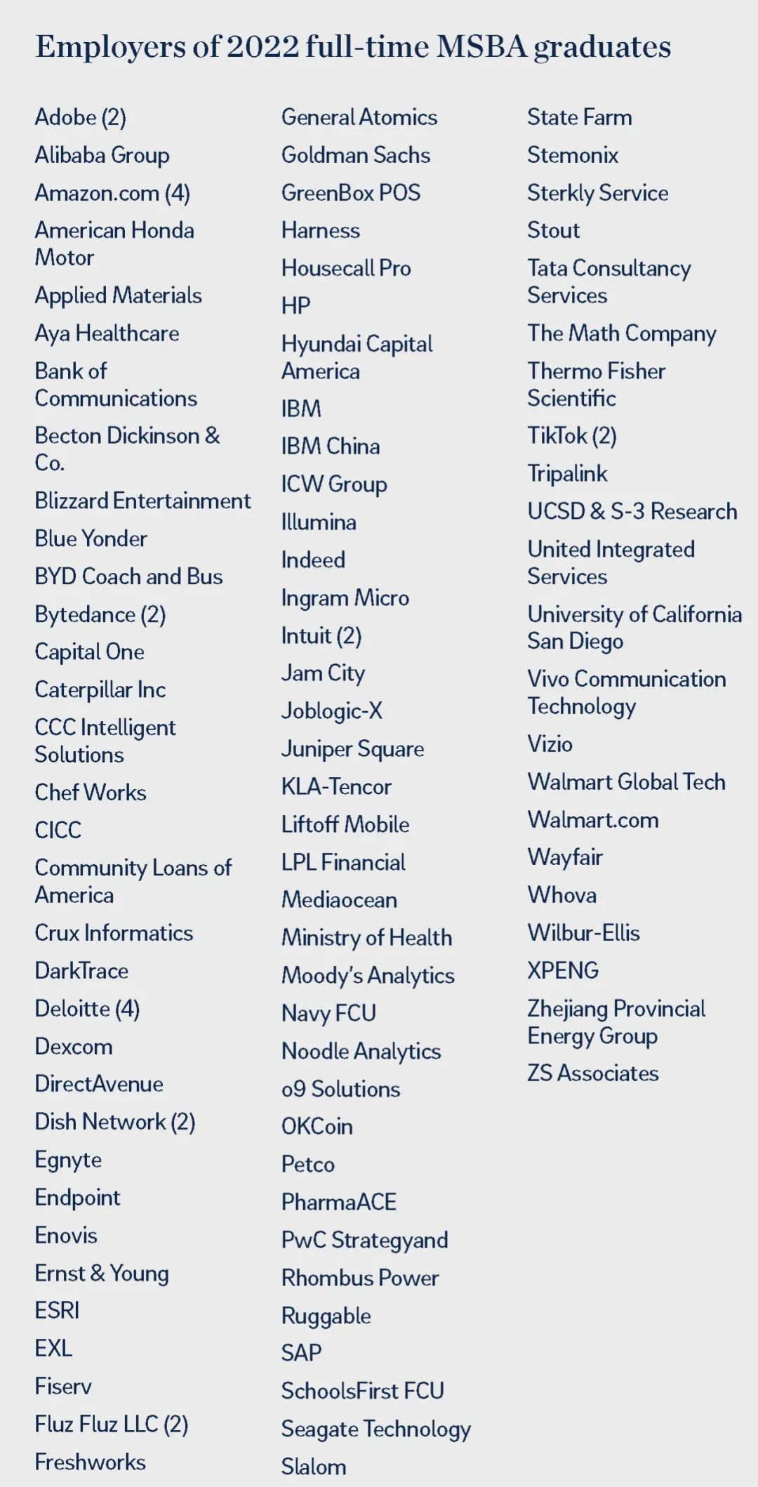 加州大学圣地亚哥分校商业分析硕士的雇主包括:
