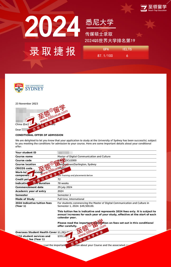 录取结果:The University of Sydney,Master of Digital Communication and Culture 悉尼大学数学传媒与文化硕士录取