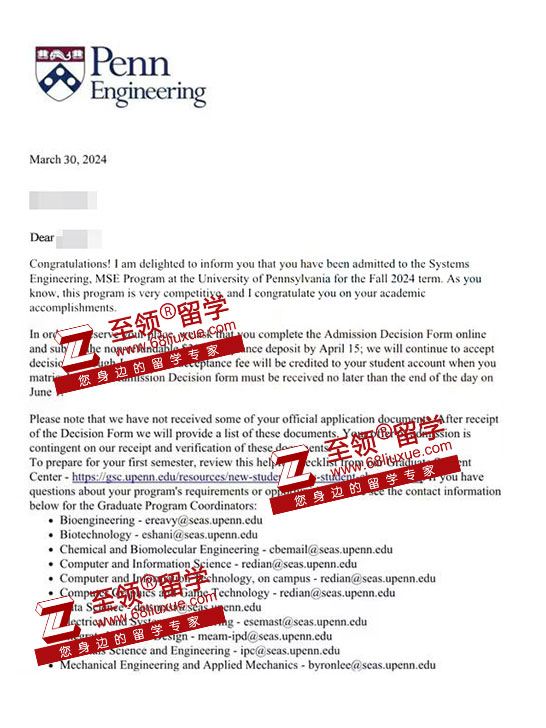 录取结果:University of Pennsylvania,MSE in System Engineering 宾夕法尼亚大学系统工程硕士录取