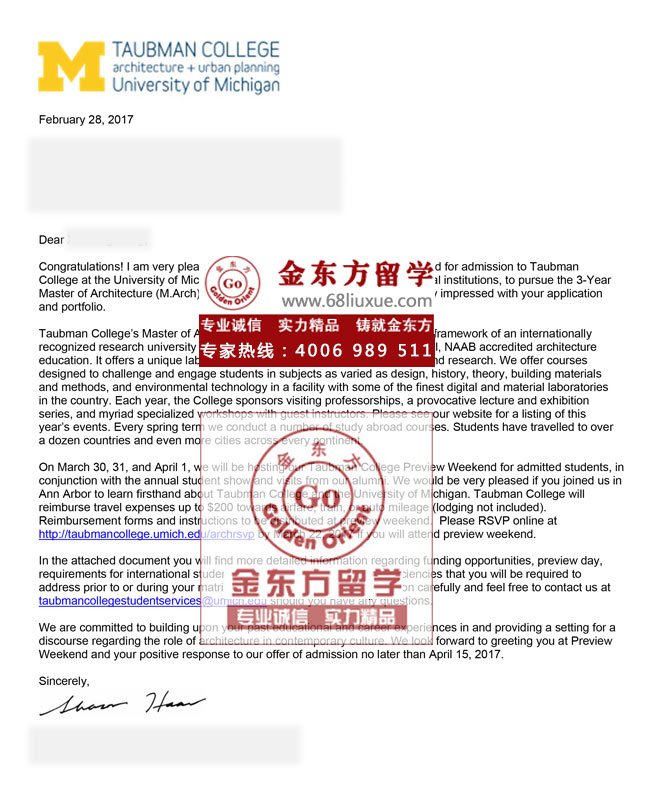 录取结果:密歇根大学安娜堡分校,3-Year Master of Architecture (M.Arch) degree Program