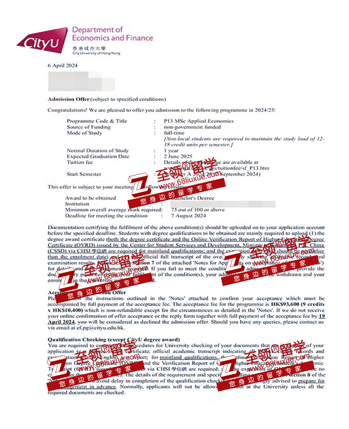 录取结果:City University of Hong Kong,MSc Applied Economics香港城市大学应用经济学硕士录取