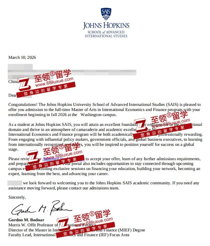 最终,在精准的申请定位、系统化的背景塑造以及高质量申请材料的共同加持下,Y同学成功斩获约翰霍普金斯大学(Johns Hopkins University)国际经济与金融硕士(MIEF)项目录取。