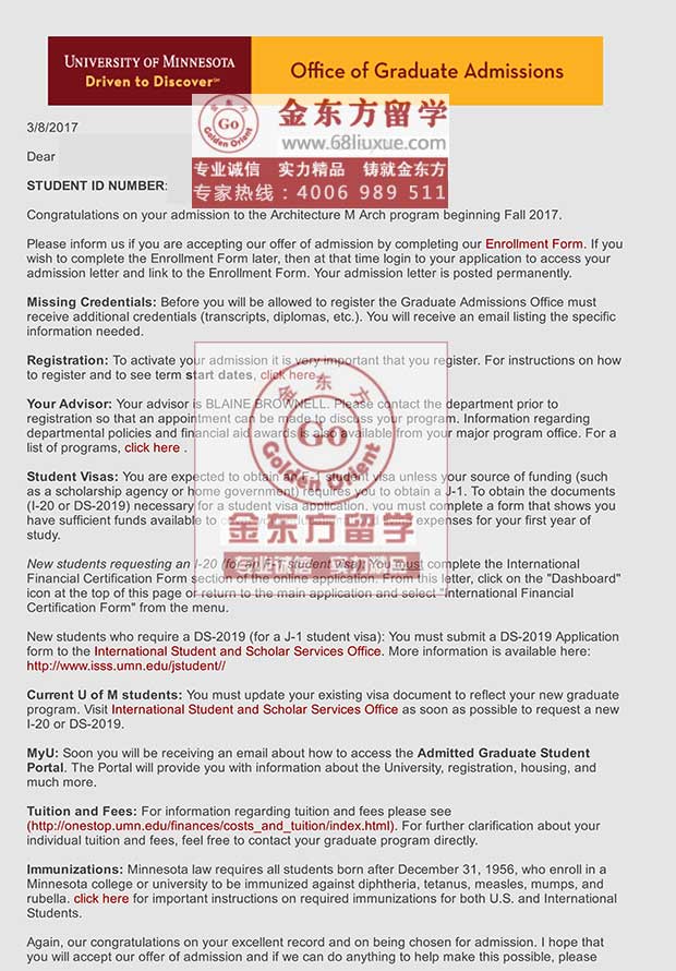 录取结果:University of Minnesota明尼苏达大学,Master of Architecture 建筑学硕士