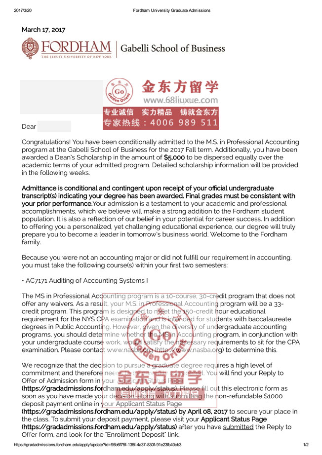 录取结果:Fordham University福特汉姆大学,Master of Science in Accounting会计硕士,奖学金$5000