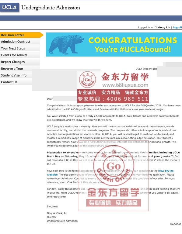 文书材料准备好后,申请顾问老师在线提交申请,帮助学生成功拿到了加州大学洛杉矶分校数学专业的录取。
