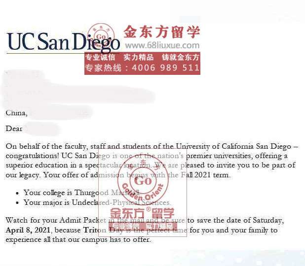 录取结果:University of California–San Diego加州大学圣地亚哥分校,物理专业本科