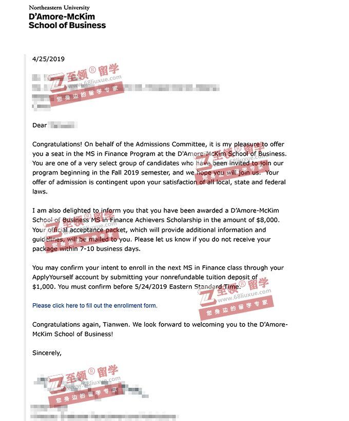 录取结果:Northeastern University ,Master of Science in Finance 东北大学金融硕士,奖学金$8000